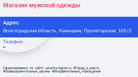 Магазин мужской одежды по адресу Волгоградская область, Камышин, Пролетарская, 101/2 в дальнейшем Организация, размещена в следующих категориях: