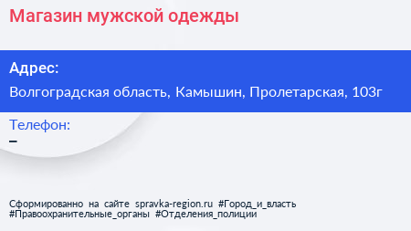 Магазин мужской одежды по адресу Волгоградская область, Камышин, Пролетарская, 103г в дальнейшем Организация, размещена в следующих категориях: