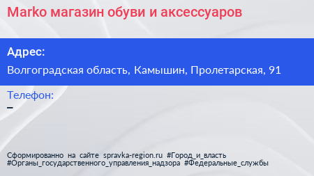 Marko, магазин обуви и аксессуаров по адресу Волгоградская область, Камышин, Пролетарская, 91 в дальнейшем Организация, размещена в следующих категориях: