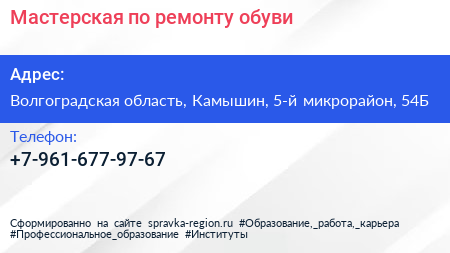 Мастерская по ремонту обуви по адресу Волгоградская область, Камышин, 5-й микрорайон, 54Б в дальнейшем Организация, размещена в следующих категориях:
