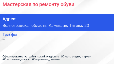 Мастерская по ремонту обуви по адресу Волгоградская область, Камышин, Титова, 23 в дальнейшем Организация, размещена в следующих категориях: