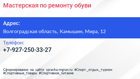 Мастерская по ремонту обуви по адресу Волгоградская область, Камышин, Мира, 12 в дальнейшем Организация, размещена в следующих категориях: