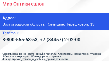 Мир Оптики, салон по адресу Волгоградская область, Камышин, Терешковой, 13 в дальнейшем Организация, размещена в следующих категориях: