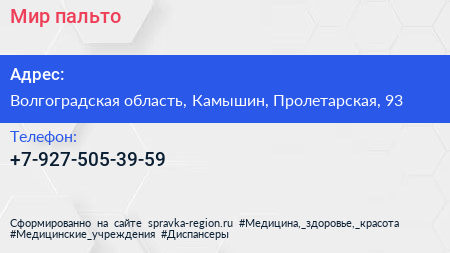 Мир пальто по адресу Волгоградская область, Камышин, Пролетарская, 93 в дальнейшем Организация, размещена в следующих категориях: