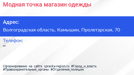 Модная точка, магазин одежды по адресу Волгоградская область, Камышин, Пролетарская, 70 в дальнейшем Организация, размещена в следующих категориях:
