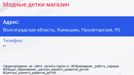 Модные детки, магазин по адресу Волгоградская область, Камышин, Пролетарская, 95 в дальнейшем Организация, размещена в следующих категориях: