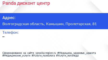 Panda, дисконт-центр по адресу Волгоградская область, Камышин, Пролетарская, 81 в дальнейшем Организация, размещена в следующих категориях: