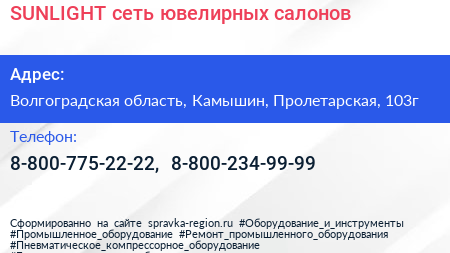 SUNLIGHT, сеть ювелирных салонов по адресу Волгоградская область, Камышин, Пролетарская, 103г в дальнейшем Организация, размещена в следующих категориях: