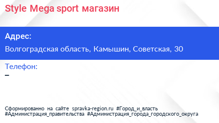 Style Mega sport, магазин по адресу Волгоградская область, Камышин, Советская, 30 в дальнейшем Организация, размещена в следующих категориях: