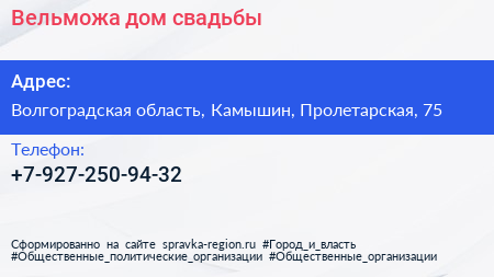 Вельможа, дом свадьбы по адресу Волгоградская область, Камышин, Пролетарская, 75 в дальнейшем Организация, размещена в следующих категориях: