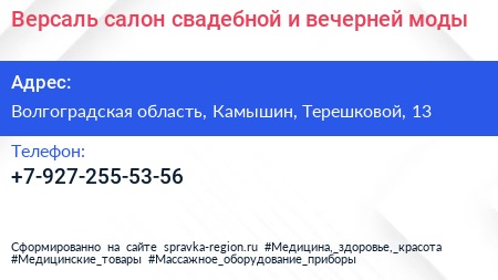 Версаль, салон свадебной и вечерней моды по адресу Волгоградская область, Камышин, Терешковой, 13 в дальнейшем Организация, размещена в следующих категориях: