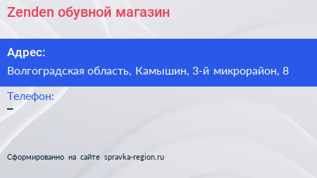 Zenden, обувной магазин по адресу Волгоградская область, Камышин, 3-й микрорайон, 8 в дальнейшем Организация, размещена в следующих категориях: