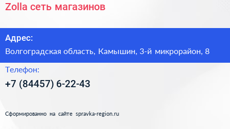 Zolla, сеть магазинов по адресу Волгоградская область, Камышин, 3-й микрорайон, 8 в дальнейшем Организация, размещена в следующих категориях: