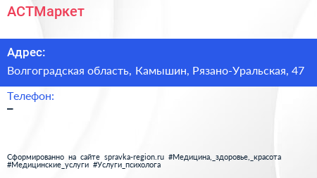 АСТМаркет по адресу Волгоградская область, Камышин, Рязано-Уральская, 47 в дальнейшем Организация, размещена в следующих категориях: