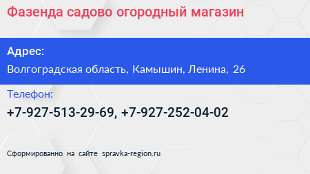 Фазенда, садово-огородный магазин по адресу Волгоградская область, Камышин, Ленина, 26 в дальнейшем Организация, размещена в следующих категориях: