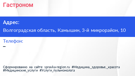 Гастроном по адресу Волгоградская область, Камышин, 3-й микрорайон, 10 в дальнейшем Организация, размещена в следующих категориях:
