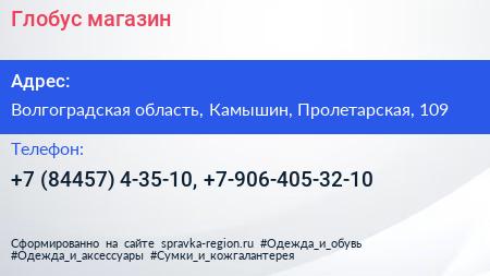 Глобус, магазин по адресу Волгоградская область, Камышин, Пролетарская, 109 в дальнейшем Организация, размещена в следующих категориях: