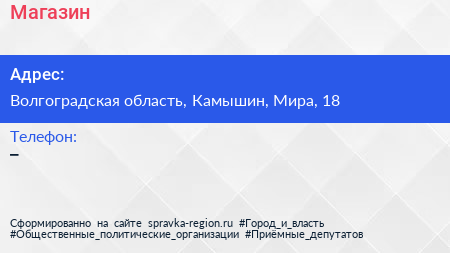 Магазин по адресу Волгоградская область, Камышин, Мира, 18 в дальнейшем Организация, размещена в следующих категориях: