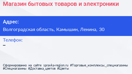 Магазин бытовых товаров и электроники по адресу Волгоградская область, Камышин, Ленина, 30 в дальнейшем Организация, размещена в следующих категориях: