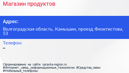 Магазин продуктов по адресу Волгоградская область, Камышин, проезд Феоктистова, 53 в дальнейшем Организация, размещена в следующих категориях: