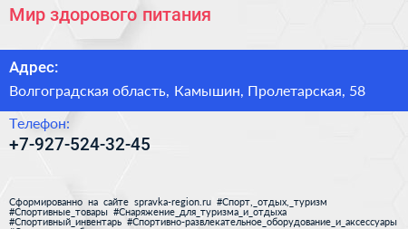 Мир здорового питания по адресу Волгоградская область, Камышин, Пролетарская, 58 в дальнейшем Организация, размещена в следующих категориях: