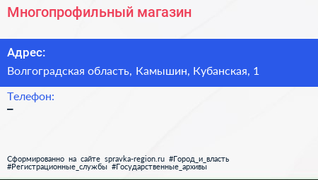 Многопрофильный магазин по адресу Волгоградская область, Камышин, Кубанская, 1 в дальнейшем Организация, размещена в следующих категориях: