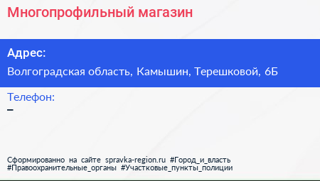 Многопрофильный магазин по адресу Волгоградская область, Камышин, Терешковой, 6Б в дальнейшем Организация, размещена в следующих категориях: