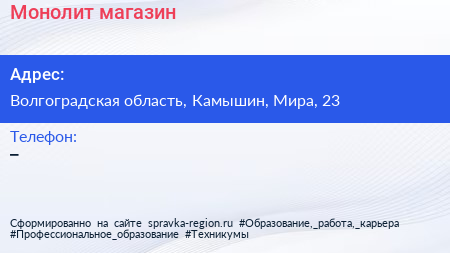 Монолит, магазин по адресу Волгоградская область, Камышин, Мира, 23 в дальнейшем Организация, размещена в следующих категориях: