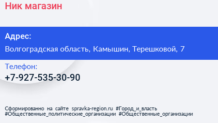 Ник, магазин по адресу Волгоградская область, Камышин, Терешковой, 7 в дальнейшем Организация, размещена в следующих категориях: