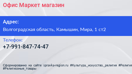 Офис Маркет, магазин по адресу Волгоградская область, Камышин, Мира, 1 ст2 в дальнейшем Организация, размещена в следующих категориях: