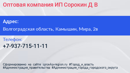 Оптовая компания, ИП Сорокин Д.В. по адресу Волгоградская область, Камышин, Мира, 2в в дальнейшем Организация, размещена в следующих категориях: