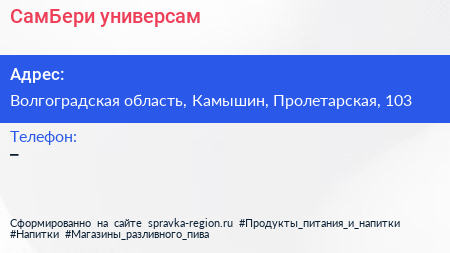 СамБери, универсам по адресу Волгоградская область, Камышин, Пролетарская, 103 в дальнейшем Организация, размещена в следующих категориях: