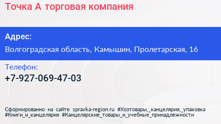 Точка А, торговая компания по адресу Волгоградская область, Камышин, Пролетарская, 16 в дальнейшем Организация, размещена в следующих категориях: