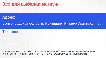 Все для рыбалки, магазин по адресу Волгоградская область, Камышин, Рязано-Уральская, 39 в дальнейшем Организация, размещена в следующих категориях: