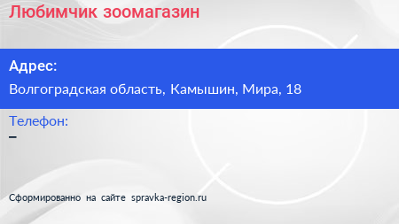 Любимчик, зоомагазин по адресу Волгоградская область, Камышин, Мира, 18 в дальнейшем Организация, размещена в следующих категориях: