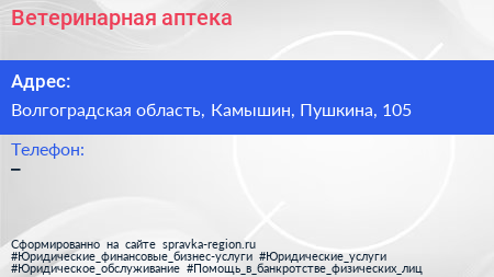 Ветеринарная аптека по адресу Волгоградская область, Камышин, Пушкина, 105 в дальнейшем Организация, размещена в следующих категориях: