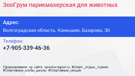 ЗооГрум, парикмахерская для животных по адресу Волгоградская область, Камышин, Базарова, 30 в дальнейшем Организация, размещена в следующих категориях: