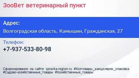 ЗооВет, ветеринарный пункт по адресу Волгоградская область, Камышин, Гражданская, 27 в дальнейшем Организация, размещена в следующих категориях: