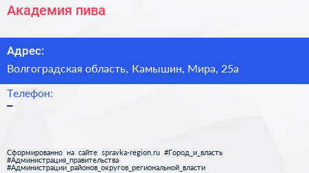 Академия пива по адресу Волгоградская область, Камышин, Мира, 25а в дальнейшем Организация, размещена в следующих категориях: