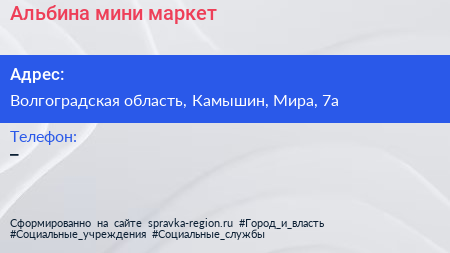 Альбина, мини-маркет по адресу Волгоградская область, Камышин, Мира, 7а в дальнейшем Организация, размещена в следующих категориях: