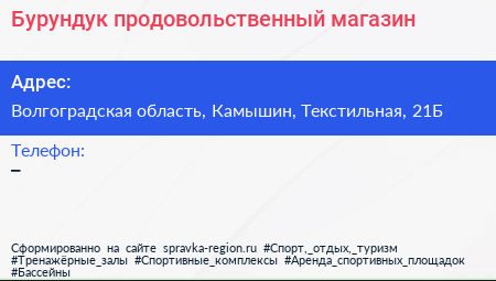 Бурундук, продовольственный магазин по адресу Волгоградская область, Камышин, Текстильная, 21Б в дальнейшем Организация, размещена в следующих категориях: