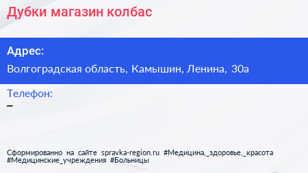 Дубки, магазин колбас по адресу Волгоградская область, Камышин, Ленина, 30а в дальнейшем Организация, размещена в следующих категориях: