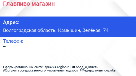 Главпиво, магазин по адресу Волгоградская область, Камышин, Зелёная, 74 в дальнейшем Организация, размещена в следующих категориях: