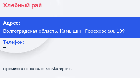 Хлебный рай по адресу Волгоградская область, Камышин, Гороховская, 139 в дальнейшем Организация, размещена в следующих категориях: