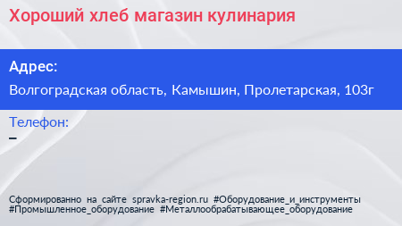 Хороший хлеб, магазин-кулинария по адресу Волгоградская область, Камышин, Пролетарская, 103г в дальнейшем Организация, размещена в следующих категориях: