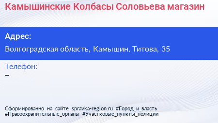 Камышинские Колбасы Соловьева, магазин по адресу Волгоградская область, Камышин, Титова, 35 в дальнейшем Организация, размещена в следующих категориях: