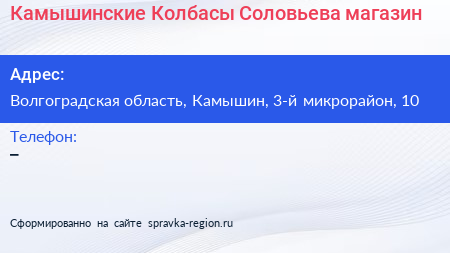 Камышинские Колбасы Соловьева, магазин по адресу Волгоградская область, Камышин, 3-й микрорайон, 10 в дальнейшем Организация, размещена в следующих категориях: