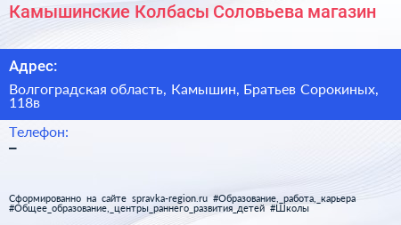 Камышинские Колбасы Соловьева, магазин по адресу Волгоградская область, Камышин, Братьев Сорокиных, 118в в дальнейшем Организация, размещена в следующих категориях: