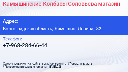 Камышинские Колбасы Соловьева, магазин по адресу Волгоградская область, Камышин, Ленина, 32 в дальнейшем Организация, размещена в следующих категориях: