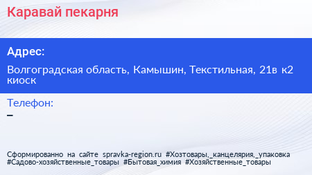Каравай, пекарня по адресу Волгоградская область, Камышин, Текстильная, 21в к2 киоск в дальнейшем Организация, размещена в следующих категориях: